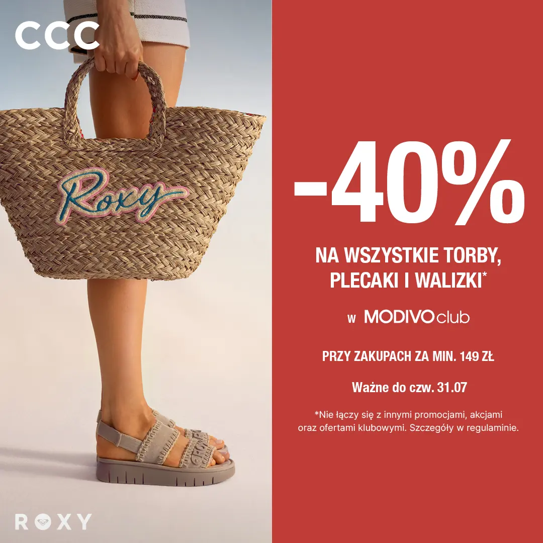 Hej, Klubowicze! Gotowi na wakacje? W CCC czeka na Was 40% rabatu na wszystkie torby, plecaki i walizki przy zakupach za minimum 149 zł. Przekonaj się, że letnie podróże mogą być pełne dobrego stylu! Oferta tylko dla Klubowiczów MODIVOclub. Szczegóły w regulaminie!